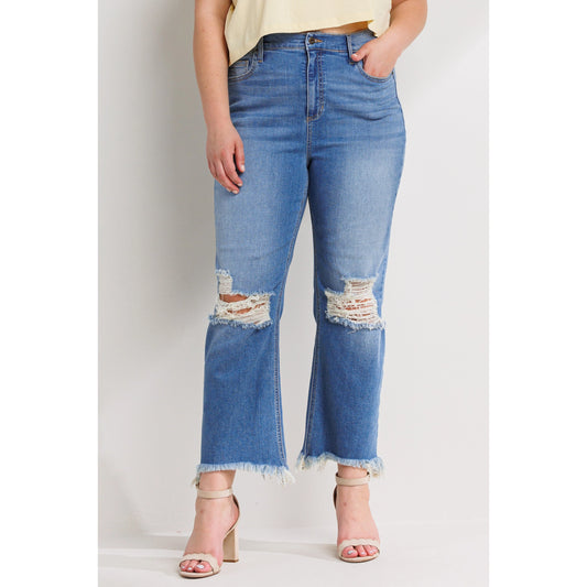 SneakPeek - High Rise Plus Size Straight Leg Jeans with Fray Hen and Distressed Knees