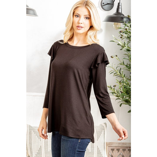 Round Neck Black Top with Ruffle Detail, 3/4 Sleeve