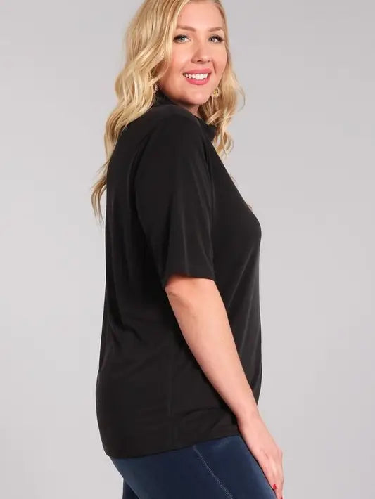 A solid knit top featuring 3/4 sleeves and a turtleneck.